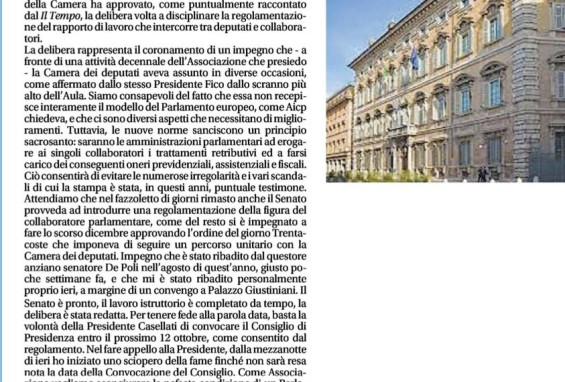 "Un passo importante per la disciplina dei collaboratori parlamentari". Così l'Associazione italiana dei collaboratori parlamentari (Aicp) saluta la comunicazione fatta in Aula sull'argomento dal senatore Gaetano Nastri, a nome del Collegio dei se...