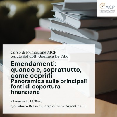 "Emendamenti quando e, soprattutto, come coprirli - Panoramica sulle principali fonti di copertura finanziaria". L’incontro è gratuito ed riservato ai soci e simpatizzanti iscritti al 2022.