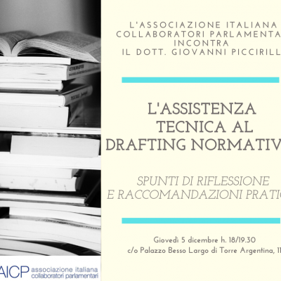 Giovedì 5 dicembre 2019 alle ore 18.00 si terrà un incontro formativo con il Dott. Giovanni Piccirilli, esperto in procedure parlamentari e drafting legislativo, che fornirà ogni elemento utile per la redazione dei testi normativi.