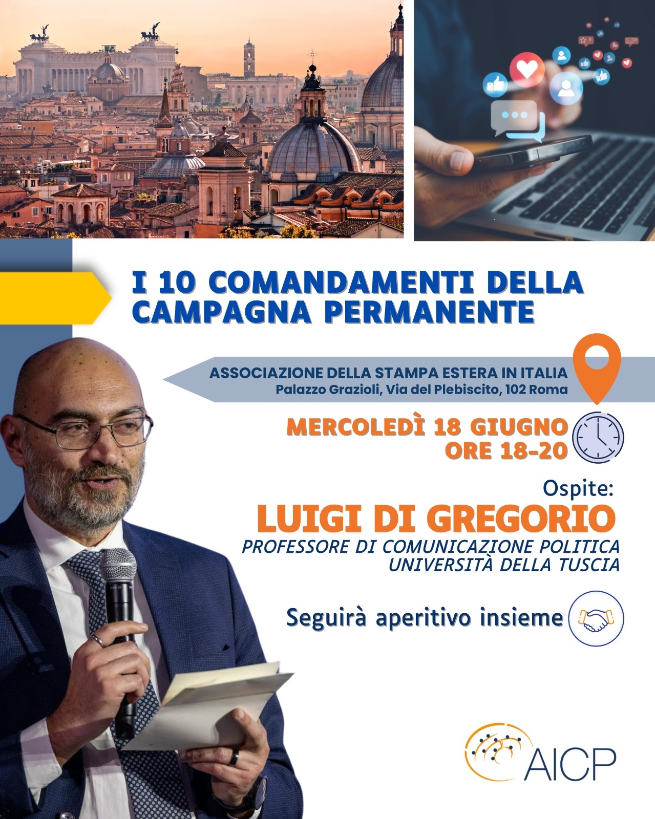 Roma, 13 giugno 2025 – Prosegue il ciclo di incontri dell’Associazione Italiana Collaboratori Parlamentari (AICP) dedicati alla comunicazione politica. Mercoledì 18 giugno alle ore 18:00, presso la sede dell’Associazione Stampa Estera (Via del Plebiscito 102, Roma), il professor Luigi Di Gregorio, docente di Comunicazione Politica all’Università della Tuscia e autore di numerosi libri, terrà una lezione dal titolo “I 10 comandamenti della campagna permanente”.