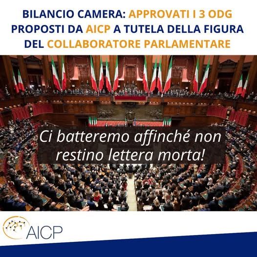 "L’Associazione Italiana dei Collaboratori Parlamentari (AICP) è grata della disponibilità e del sostegno dei deputati Anna Ascani, Benedetto Della Vedova, Riccardo Magi, Giorgio Mulé, Luca Pastorino, Paolo Emilio Russo, Manfred Schullian e Stefano Vaccari che hanno presentato tre ordini del giorno volti completare e rendere effettivo il processo di regolamentazione dei Collaboratori Parlamentari, con l’obiettivo di migliorare la disciplina esistente, rafforzandone la trasparenza e potenziando gli strumenti per lo svolgimento delle attività di collaborazione, fondamentali per il corretto esercizio del mandato di tutti i parlamentari", lo dichiara José De Falco, presidente di AICP.