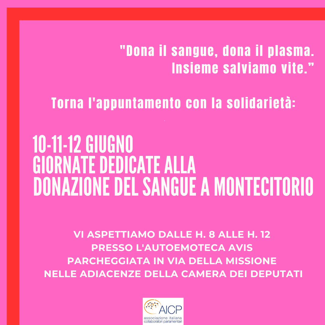 Il 10/11/12 giugno dalle h. 8 alle h. 12 domani fino a giovedì vi aspettiamo per il consueto appuntamento con la donazione del sangue a Montecitorio.