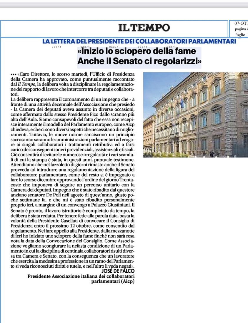 Per tenere fede alla parola data, basta la volontà della Presidente Casellati di convocare il Consiglio di Presidenza entro il prossimo 12 ottobre, come consentito dal regolamento. Nel fare appello alla Presidente, dalla mezzanotte di ieri ho iniziato uno sciopero della fame finché non sarà resa nota la data della Convocazione del Consiglio. Come Associazione vogliamo scongiurare ad ogni costo la nefasta condizione di un Parlamento in cui la disciplina di centinaia collaboratori risulti diversa tra Camera e Senato, con la conseguenza che un lavoratore che esercita la medesima professione in un ramo del Parlamento si veda riconosciuti diritti e tutele, e nell'altro li veda negati. Siamo certi che la Presidente del Senato, Maria Elisabetta Alberti Casellati, non permetterà che la legislatura giunga a conclusione senza che questo indispensabile adempimento sia stato portato a termine.