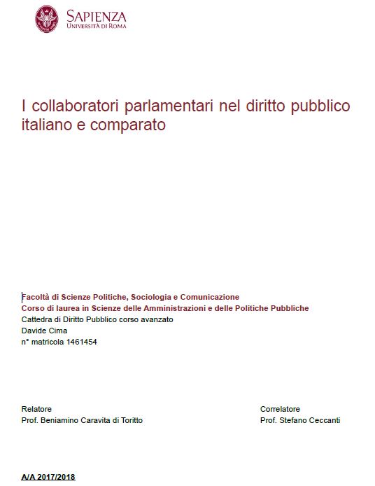 Di seguito pubblichiamo la Dedica e l'Introduzionedella tesi "I collaboratori parlamentari nel diritto pubblico italiano e comparato" discussa nell'anno accademico 2017/2018 dal dott. Davide Cima presso la Facoltà di Scienze Politiche, Sociologia e Comunicazione, Corso di laurea in Scienze delle Amministrazioni e delle Politiche Pubbliche, Cattedra di Diritto Pubblico corso avanzato.